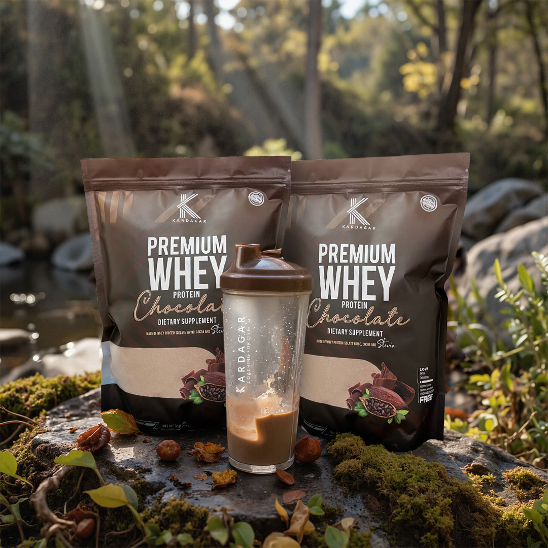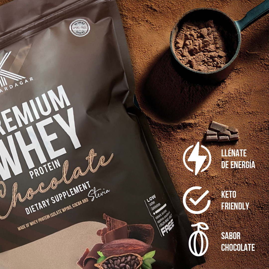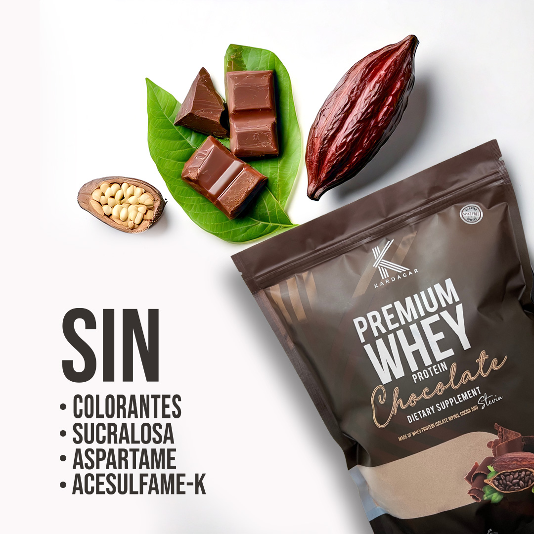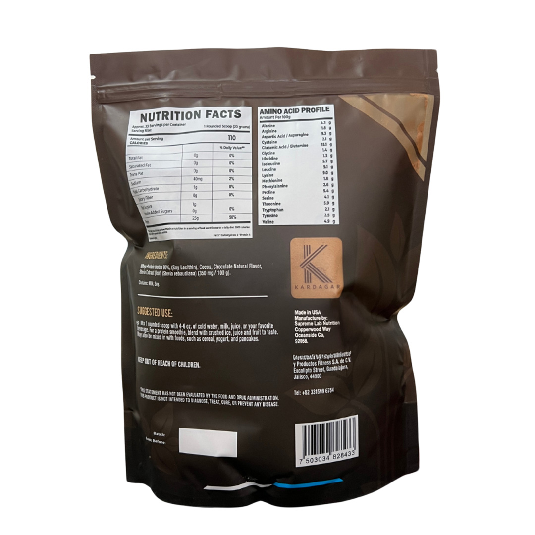 90% whey protein isolate with cocoa and stevia, free of rBGH and rBST.