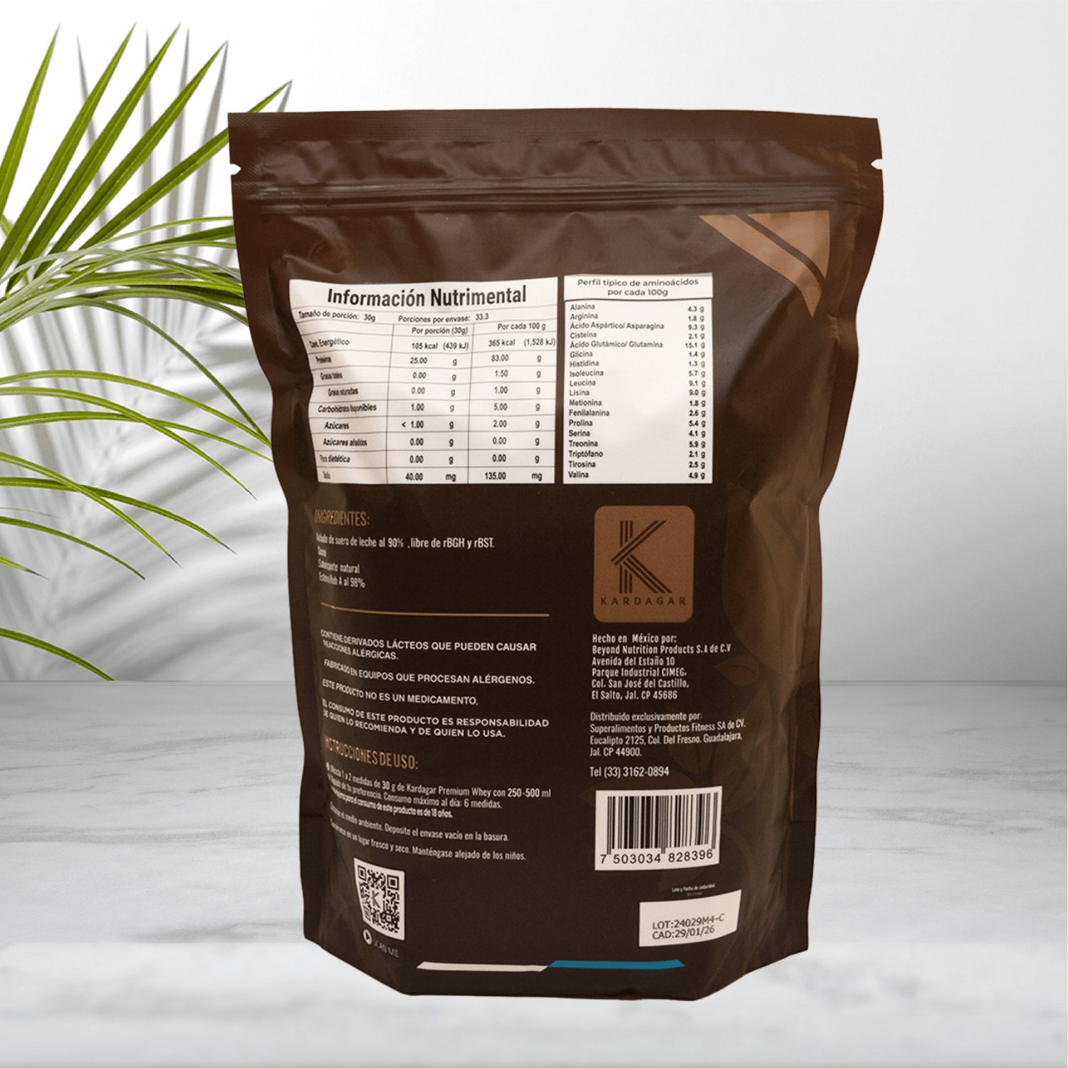 90% whey protein isolate with cocoa, coffee, and stevia, free of rBGH and rBST.